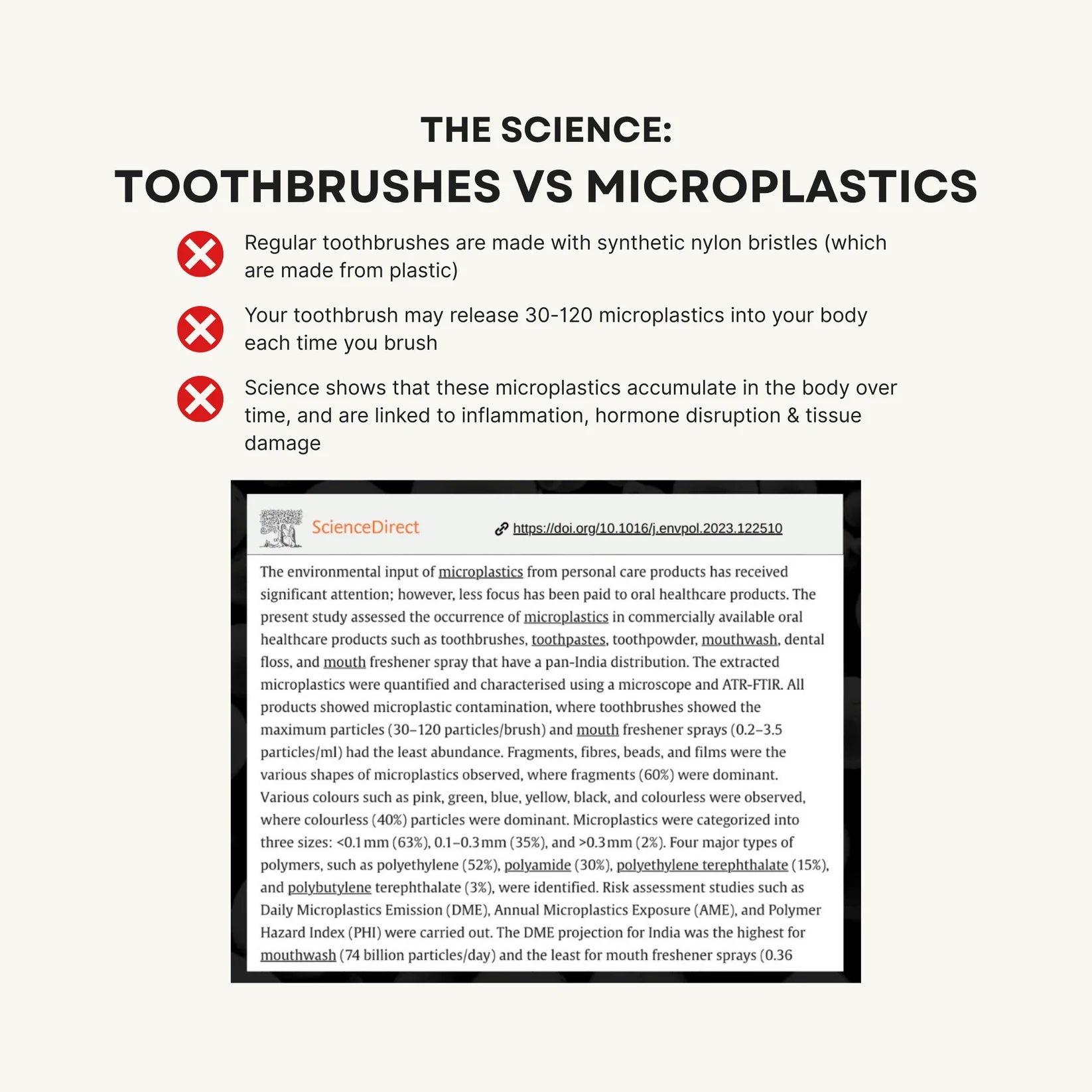 And when you grind them against your teeth every time you brush; nylon bristles break down and shed microplastics into your mouth, digestive pathways, and bloodstream.