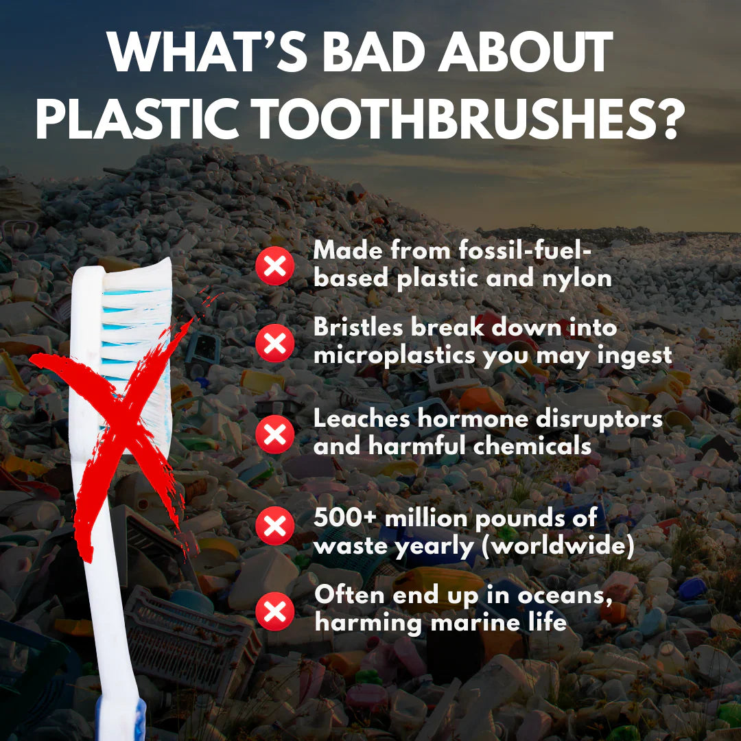 Plus nylon bristles damage enamel and cause gum recession. One billion plastic toothbrushes hit US landfills annually Alone.
